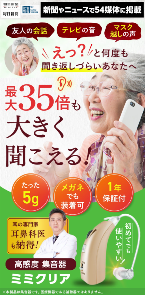【PR】ミミクリア 【集音器(補聴サポート機器)】の紹介です。聞き取りにくさを感じ始めると、補聴器との違いや選び方で迷う人も多いようです。会話をスムーズにしたい、父母や祖父母へのプレゼントを探しているなど、比較検討の段階で情報整理を求める声もあります。日常会話の聞き取り補助を目的とした集音器タイプ。耳を塞がない形状や目立たない設計を意識したモデルで、自宅・外出・テレビ視聴など幅広いシーンで検討されることがあるようです。♡:.。. .。.:♡:.。. .。.:♡*:.。. .。.:♡向いているのは、自然な会話サポートを求める人、周りにバレない装着感を重視する人、ギフト用途として選択肢を探したい人など。おしゃれさや扱いやすさを重視する層にも比較対象として見られることがあります。最大音量の調整幅、ノイズ制御機能、充電式設計、2モード切替などが整理された特徴。ガイド付きで扱いやすさを意識した点や、価格帯の試しやすさも検討材料になりやすい部分です。通販形式で比較しやすく、仕様確認やセット選択がしやすい点も選ばれる背景の一つとされています。♡:.。. .。.:♡:.。. .。.:♡*:.。. .。.:♡参考情報としてチェックされることもあるようです。補聴器選びの比較候補として情報収集する人もいるようです。聞こえのサポート機器を探す際の材料の一つとして整理しました。♡:.。. .。.:♡:.。. .。.:♡*:.。. .。.:♡《価格》両耳対応(片耳)1個・・・¥9,980 (税込)両耳対応 2個セット・・・¥15,968 (税込) 20%OFF 詳細はこちらをクリック ↓ご購入はこちらのバナーから 商材名 ミミクリア運営者 Y.Y※当サイトはアフィリエイトプログラムを利用し宣伝目的で作成しております。